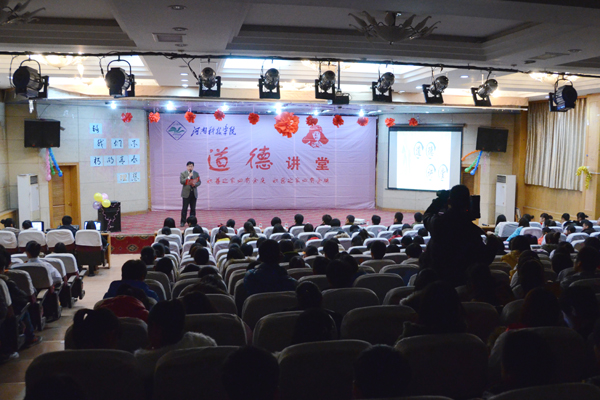 2013年12月31日晚,由校文明办主办、动物科学学院承办的我校第四场“道德讲堂”活动在图教201教室举行。校党委宣传部、校团委、动物科学学院等相关单位负责人及动物科学学院师生代表300余人参加了此次活动。活动由动物科学学院党委副书记徐兆栋主持。
