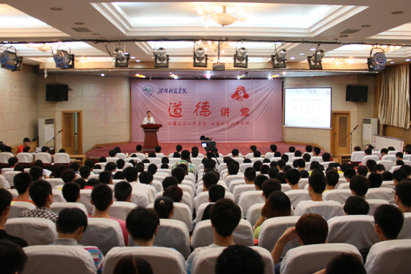 6月19日晚,由校文明办主办、机电学院承办的我校第六期“道德讲堂”在图教201举行。校党委宣传部、学工部、机电学院负责同志,机电学院各年级辅导员以及全体大一学生共计300余人参加了此次活动。