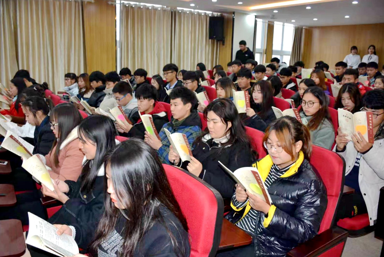 12月12日下午,高职学院在综合楼阶梯报告厅举办道德讲堂,学院班子成员、学工队伍全体老师及一百余名学生代表参加。