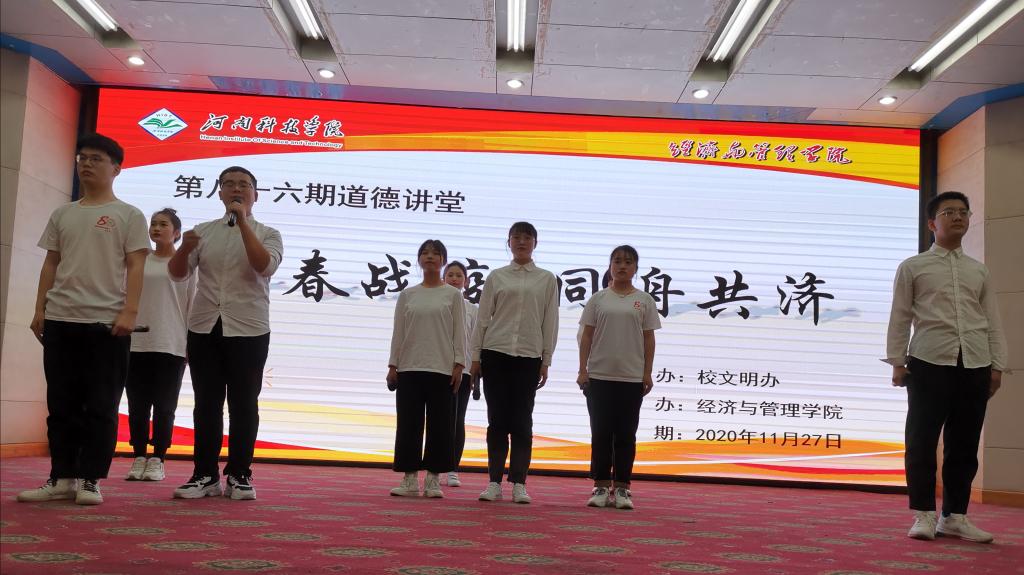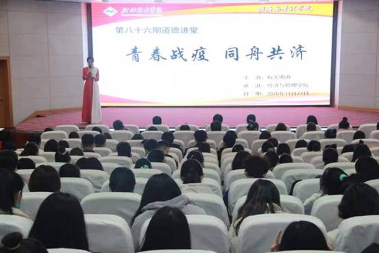 本次道德讲堂以“青春战疫,同舟共济”为主题,共分为六个环节,分别是歌曲、故事、短片、模范、经典与点评。听了一首《别怕,我在这里》,观看了武汉从封城到解封的纪录片,看了钟南山的先进模范事迹,在座师生无不热泪盈眶,深刻体会到了在这场同严重疫情的殊死较量中,全国人民生命至上、举国同心、舍生忘死、尊重科学、命运与共的伟大抗疫精神。正如丁雅娴同学所说“一个有希望的民族不能没有英雄,一个有前途的国家不能没有先锋”。最后,何二毛作出总结讲话,他指出青年一代要正确认识形势发展变化,敢于应对重大事件和不确定性因素,以疫为鉴,励志勤学,健康成长,争做坚强、乐观、阳光、担当的新时代大学生。