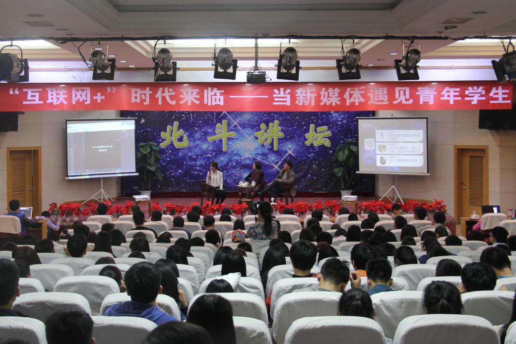 为进一步凝聚、引领、服务青年学生,把新媒体打造成共青团系统思想引领和成长成才服务的新途径、新载体,4月8日晚,以“互联网+时代来临,当新媒体遇见青年学生”为主题,我校第十期“北斗讲坛”在图教201举行。新乡电视台新媒体中心副主任宋鸿、河南企翼网络科技有限公司运营总监孙寅做客“北斗讲坛”。各学院新媒体工作有关学生干部代表300余人参加了活动。
