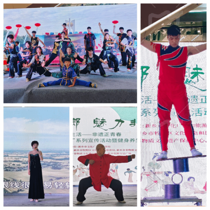 随后,众人前往新乡市万达广场,受邀参加“游好新乡・魅力非遗”“融入现代生活——非遗正青春”新乡市2025“文化和自然遗产日”系列宣传活动暨健身养生市集启动仪式。随着中原和邦龙狮团带来的开场舞和邦狮艺登场,现场气氛瞬间被点燃,灵动的狮头上下翻飞,栩栩如生。获嘉县罗汉武术院的《龙腾盛世》集体表演,动作整齐刚劲,尽显中华武术的磅礴气势。